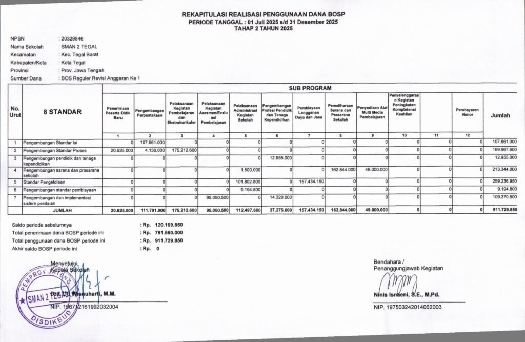 Berikut adalah Rekapitulasi Realisasi Penggunaan Dana BOSP SMA Negeri 2 Tegal 2025